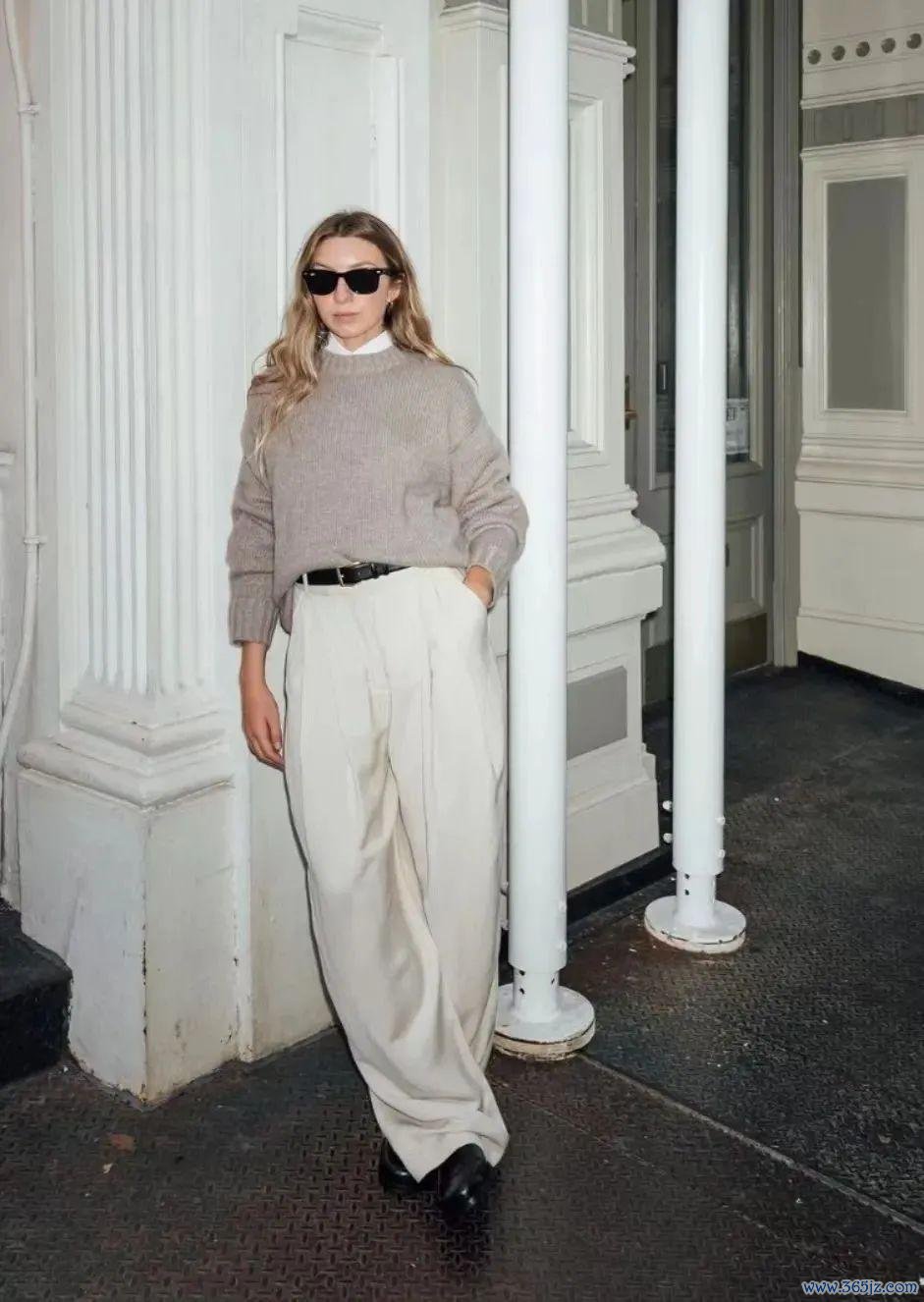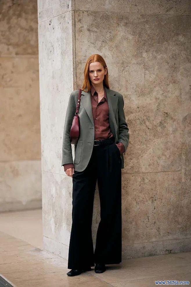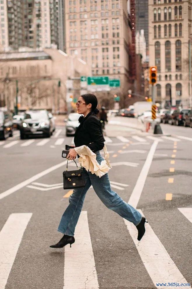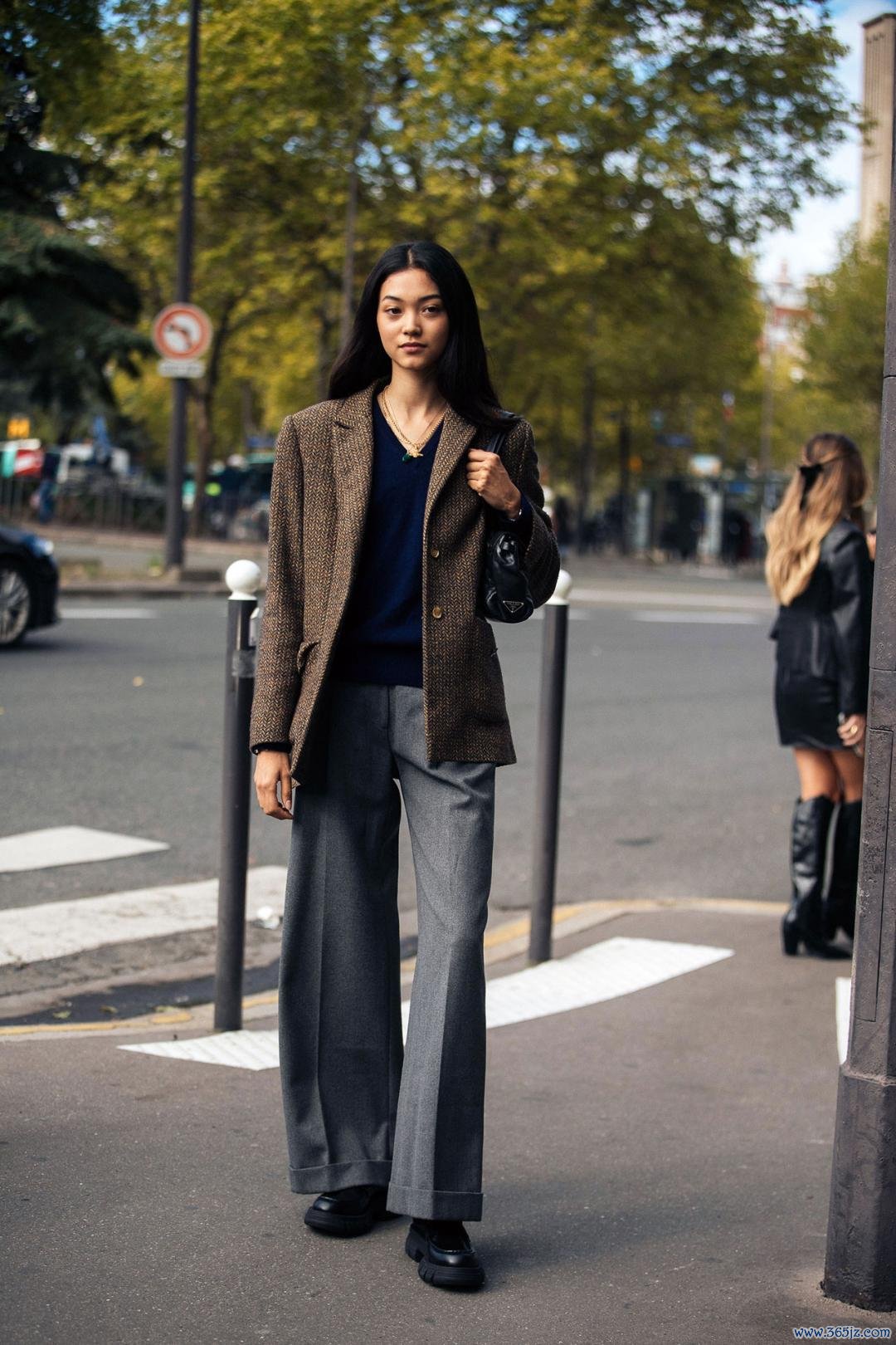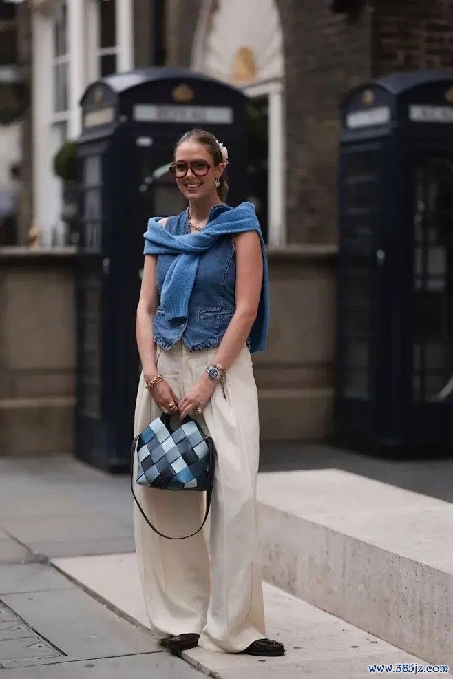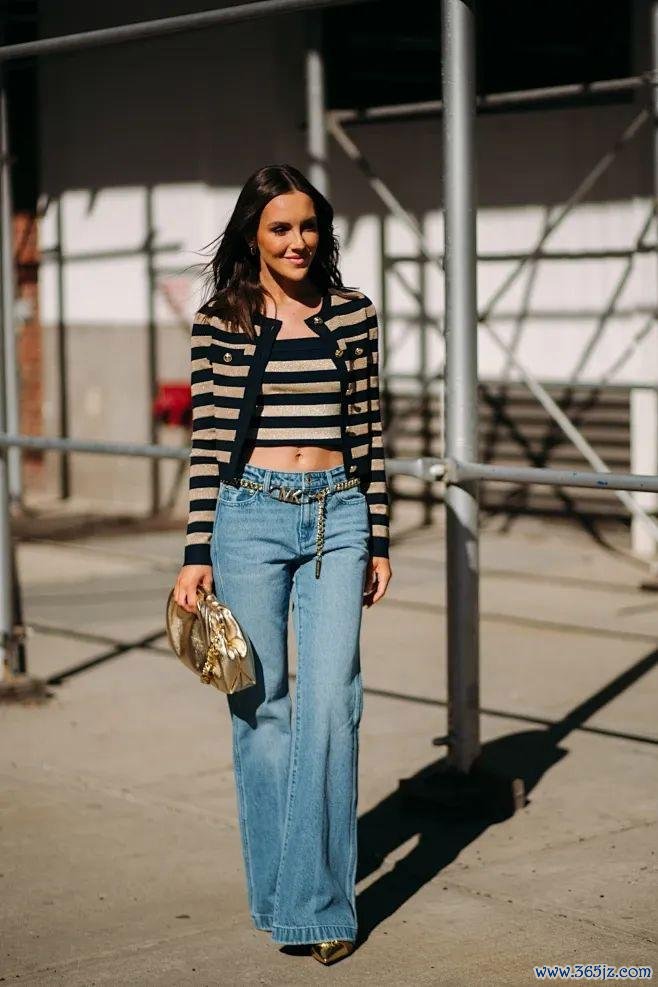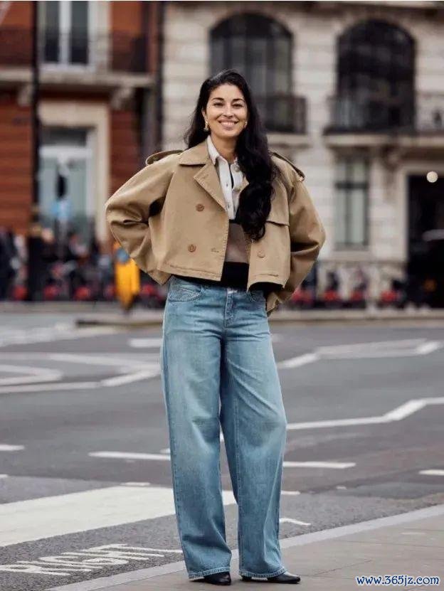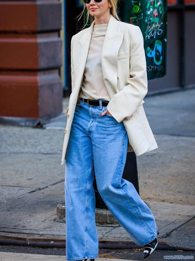 牛仔裤要失业一些,而阔腿西裤则可以用来打造比拟负责的通勤风。