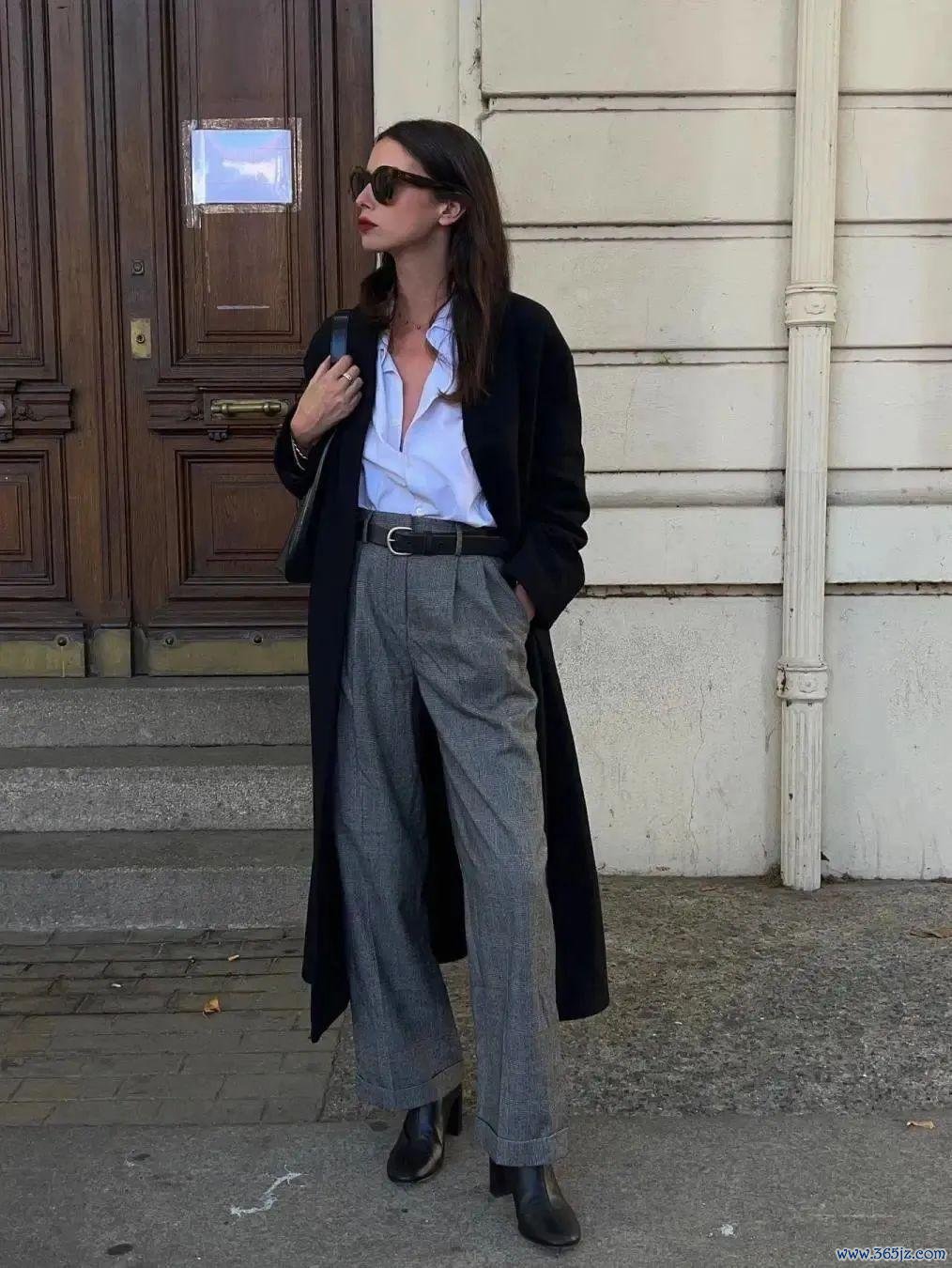 最常见、最佳穿的等于黑、白、灰色阔腿裤篮球买球下单平台,把上衣扎进裤子内部穿会更显比例。