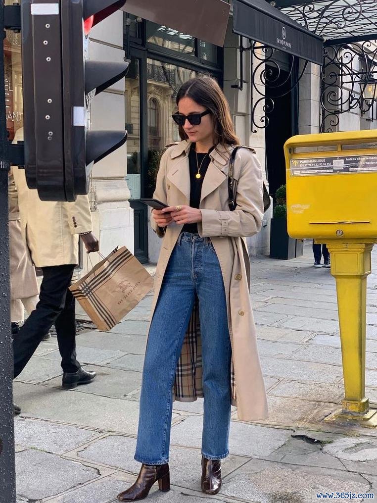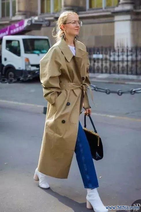 一条九分蓝色牛仔裤,搭配一对干练的白色短靴,再披上一件卡其色风衣,散漫出一股超逸的气质,让每一步齐显得自信而优雅。