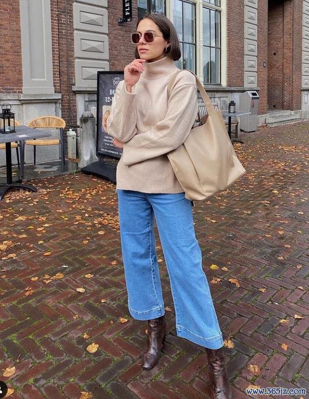 高领毛衣成为了秋冬季节的骄子,搭配九分裤和短靴,哀感顽艳地为举座造型增添了一点帅气,仿佛是在诉说着这位女性的寥寂与鉴定。
