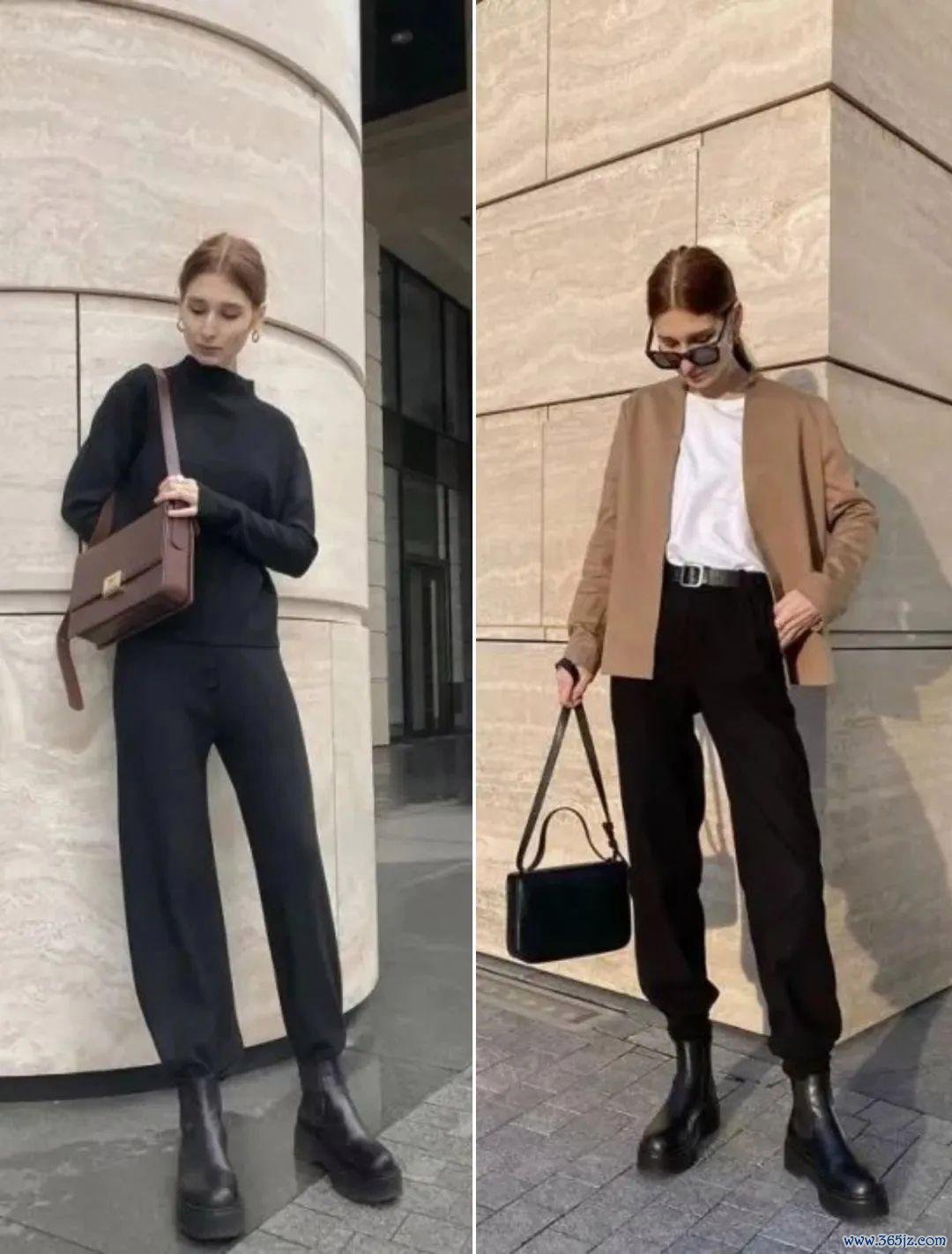 可以对比一下各式长度的裤子+短靴呈现出来的礼貌。