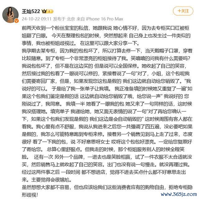10 月 22 日,杜淳妻子王灿发长文讲演曾被柜姐脑怒的履历,命令拒却专柜隐形脑怒。