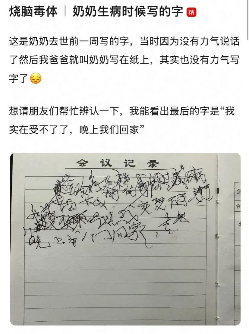 这些被留在小组里恭候鉴别的笔迹,早已不仅仅字。他们大多像一团团符号,要么重重叠叠,要么笔画残败,要么倾斜变形:“平常咱们写的东西皆是有明确封闭的,不外是写好写坏的问题。但许多临终病东谈主抒发的实质仍是终点依稀了。”