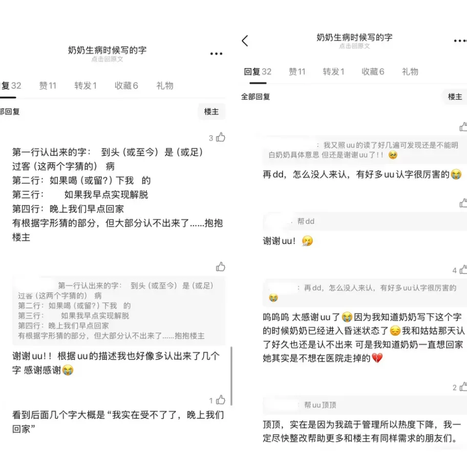 一张写于重症监护室里的字条,成为最快被认出的笔迹之一。乞助发布于2023年11月20日19时10分,不到50分钟后,一个最有可能的谜底在多条留言里强迫出来。冀梦雨还铭刻阿谁谜底,老东谈主写的是“口里有东西”。