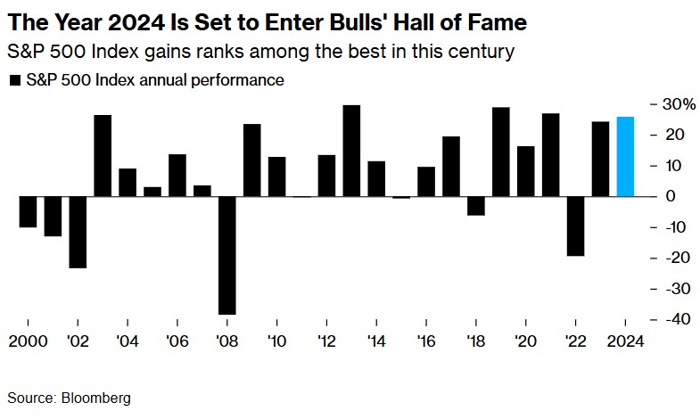 2024年好意思股注定要投入牛市名东谈主堂——标普500指数涨幅在本世纪名列三甲